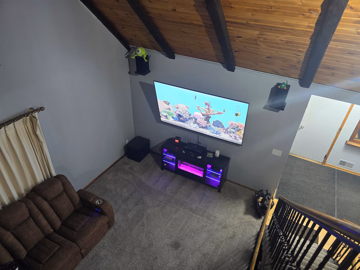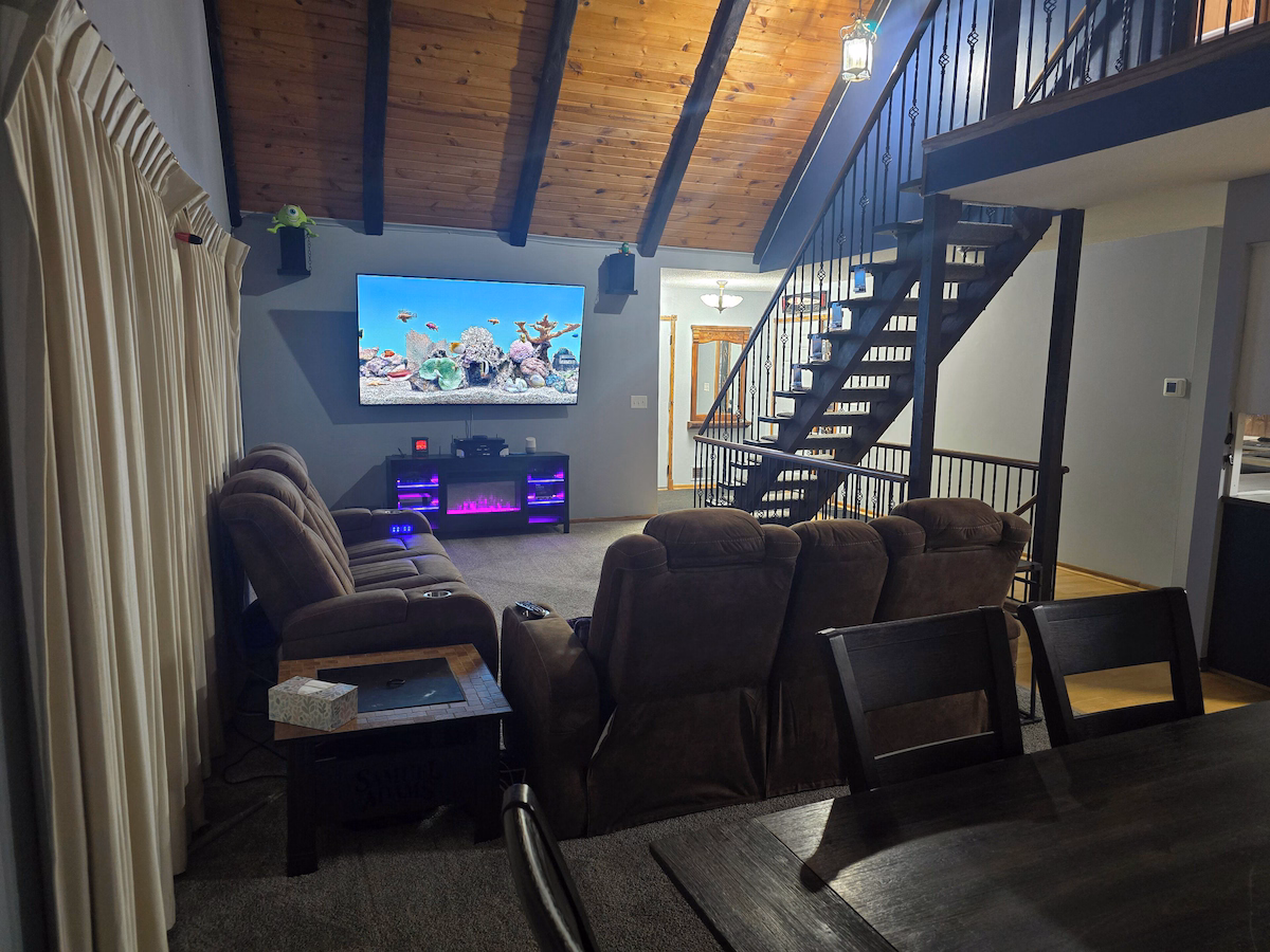 This beautiful 3+ bedroom A-Frame on 1 1/2 acres features a full kitchen with all stainless steel appliances, 4 Queen beds, 2 extra large screen TVs with full surround, additional TVs in every bedroom, high speed internet, pool table, laundry on site, secluded parking and more. Get away from the city for a weekend and have the 2,500+ square feet of living space to you and yours. In town for a tournament and don’t want a tiny hotel? Touring the area for real state? Fishing on a local lake? Visiting family and want your own space? Contact me for pricing and terms.
