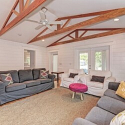 The first room you enter at The Beach Cottage is a large screened in porch with plenty of seating for relaxing, reading a book, drinking your morning coffee, or your glass of wine after dinner. From the screened in porch you enter the large family room complete with comfy couches for an entertaining family game or movie night. The Beach Cottage is equipped with a large gourmet kitchen with state of the art appliances. Right outside of the kitchen is a gas Weber grill to maybe enjoy your fresh catch of the day next to your private heated pool. There are two master bedrooms, both with king size beds. One of the master bedrooms has its own private bathroom while the other has a pocket door to the shared bathroom. The kids room, which sleeps four, has custom built bunk beds complete with reading lights and book shelves. Each of the bedrooms have smart TVs.